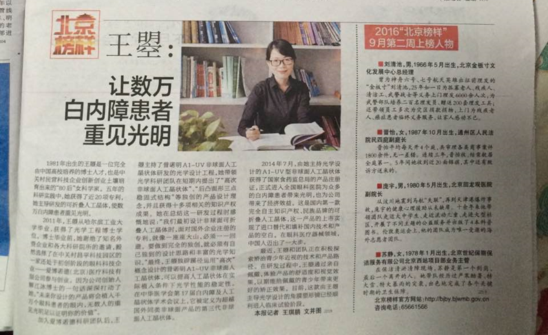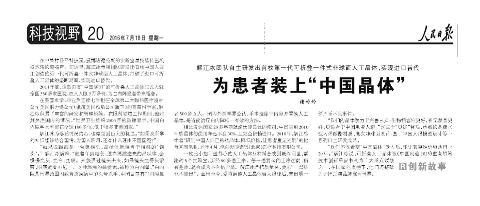 2016年7月28日出版的《人民日報》科技視野版以“解江冰團隊自主研發(fā)出首枚第一代可折疊一件式非球面人工晶體——為患者裝上中國晶體”為題,發(fā)表了記者謝婷婷的采訪報道。
